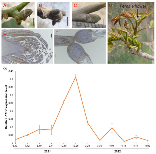FLC accumulation in precocious walnut variety ‘Xinwen 81’ during bud dormancy. (A–D) Representative images of buds at several growth stages of precocious walnut: (A) bud differentiation, (B) bud dormancy, (C) bud sprout, and (D) floral formation and leaf expansion. (E–F) Internal morphological analysis of (E) dormant buds and (F) floral buds. (G) Dynamic expression levels of JrFLC in ‘Xinwen 81’. Bars in (A–C) were 0.5 cm; bar in (D) was 1 cm; bars in (E,F) were 50 nm. For qRT-PCR assays, bars in (G) indicated the standard deviations.