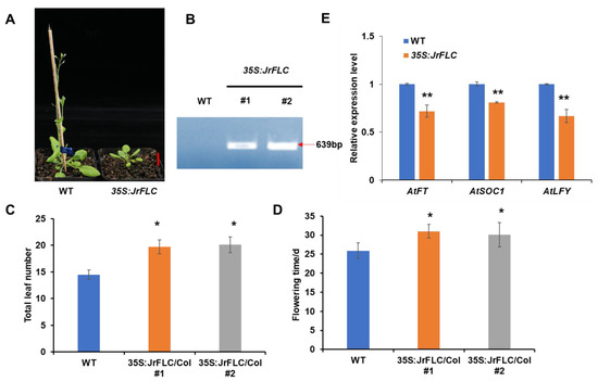 Functional validation of Juglans regia FLC via overexpression in Arabidopsis. (A) Representative image of wild-type (WT) and JrFLC-overexpression (35Spro:JrFLC) plants of the same growth stage. (B) Validation of JrFLC overexpression in transgenic plants via quantitative reverse transcription PCR. (C,D) Quantification of (C) total leaf number and (D) flowering time in WT and 35Spro:JrFLC Arabidopsis plants. (E) Expression levels of flowering genes downstream of FLC (FT, SOC1, and LFY) in WT and 35Spro:JrFLC Arabidopsis plants. Bar in (A) was 2 cm. At least 10 Arabidopsis plants for each line were scored with flowering time and total leaf number; significant differences between the means of the indicated genotypes were revealed by a two-tailed Student’s t-test (* p < 0.05; ** p < 0.01). For qRT-PCR assays and measurement of flowering time, bars indicated the standard deviations.