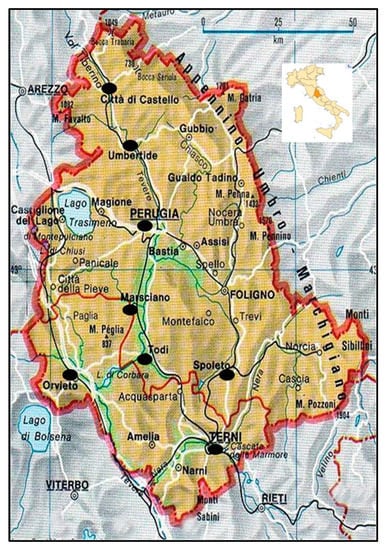 The study area is the region of Umbria (Central Italy), which covers an area of about 8.456 km2, located in an inland zone of central Italy (Figure 1). It is characterized by a complex orography and is mainly hilly in the central and western areas, with elevations ranging from 100 to 800 m asl. The climate is mainly sub-coastal temperate [26], and precipitation is mainly concentrated during the autumn and winter season.