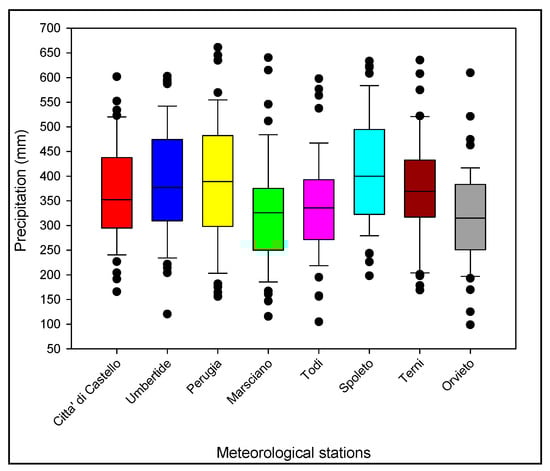 In Figure 2, the statistical descriptors of the precipitation recorded from April to September are reported for each Umbrian station. In Figure S1, the same sample descriptors are reported per year. Table S1 reports the annual cumulated precipitation (mm), while Table S2 reports the monthly precipitation (mm) for each meteorological station for the period of 1974–2021. The year 2011 was recorded as the driest year in Città di Castello, Spoleto, and Todi stations (with less than 570 mm of precipitation); the year 1985 was the driest in Orvieto and Perugia stations (around 500 mm); the year 2007 was the driest for Terni (517 mm) and 2017 for Marsciano (472 mm) (Table S1). The driest month was July in all of the meteorological stations, with 36 mm of precipitation on average, followed by August (51 mm of precipitation on average), while the wettest month was November, with 112 mm of precipitation on average (Table S2).