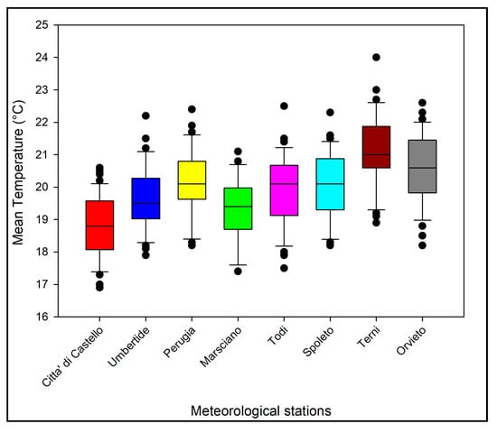 Figure 3 shows the statistical descriptors of the temperature (April–September) in each Umbrian station. The mean temperature values varied from 18.83 °C in Città di Castello (North of the Region) to 21.1 °C in Terni (South of the Region). The minimum temperature was registered in Città di Castello (16.9 °C), followed by Marsciano (17.4 °C) and Todi (17.5 °C). The maximum temperature was observed in Terni (24 °C), followed by Perugia (22.6 °C) and Todi (22.5 °C). In the studied period, a difference of about 2 °C was observed between the coldest (Città di Castello) and the warmest (Terni) location (Tables S1 and S2).