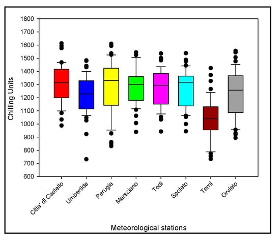 In Figure 4, the box plots of chilling units per station were reported. Figure S2 shows the chilling units per year. The chilling accumulation was, on average, over 1200 CU for each station, with a median value of 1300 CU. The minimum value of 988 CU was recorded in the year 2015 for Città di Castello station (Figure S2) and 734 CU in 2001 for Terni station. On the other hand, in the stations of Marsciano, Orvieto, Perugia, Spoleto, Todi, and Umbertide, the lowest chilling accumulation was recorded in 2020, respectively, as 940 CU, 894 CU, 832 CU, 944 CU, 943 CU, and 732 CU.