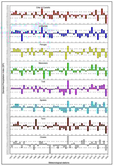In Figure 5, the annual values (1974–2021) of the Standard Precipitation Index (SPI) were reported for each station (Figure S3). As shown in Figure 5, the SPI for all the stations were lower than −1 for a minimum of 7 years. Specifically, in Città di Castello and Marsciano, 7 years resulted in dryness (SPI < −1), with minimum SPI values of −2.74 (2021) and −2.6 (1990), respectively.