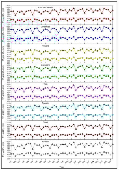 Except for Orvieto, the highest ET0 values for the station were recorded in the year 2003, with an average value of 966 mm. In Orvieto, the ET0 reached its maximum peak (984 mm) in 2017.
