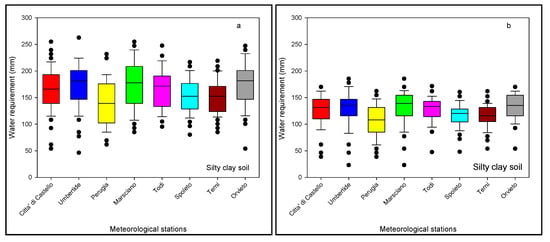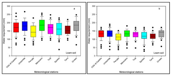 In Figure 7a, the water requirement for loam soil during June–August was evaluated using Equation (1) and reported for all the stations. Figure S6 shows the water requirements from June to August per loam soil, recorded from 1974 to 2021 in each station. As shown in Figure 7a, higher values of water requirements were assessed for Marsciano, Orvieto, Umbertide, and Città di Castello.