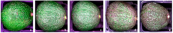 Figure 1. RGB (red, green, blue) images generated through hyperspectral imaging of a single Hass avocado fruit with (a) 14 days left to ripen; (b) 10 days left to ripen; (c) 6 days left to ripen; (d) 2 days left to ripen; (e) 0 days left to ripen (completely ripe).