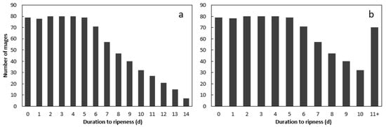 Figure 2. (a) Number of original hyperspectral images of Hass avocado fruit in each ripeness-stage category; (b) number of hyperspectral images of Hass avocado fruit in each category after combining the categories with 11–14 days to ripeness.