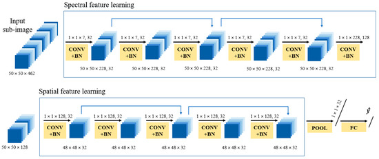 Figure 3. Spectral–spatial residual network architecture with 50 × 50 × 462 input volume (Z). CONV + BN denotes a convolutional layer with batch normalization, POOL denotes an average pooling layer, and FC denotes a fully connected layer that outputs a single continuous value y ^ .