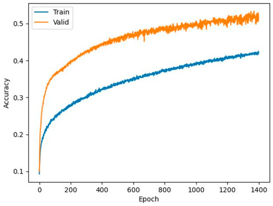Figure 5. Prediction accuracy curves of the training (blue curve) and validation (orange curve) datasets for the classification model for predicting the duration to ripeness of Hass avocado fruit.