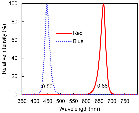 Light spectral distributions of red and blue LEDs in this experiment. The numbers inside the peak waves are values of phytochrome photostationary state (PPS), which are calculated based on light spectral distribution [15].