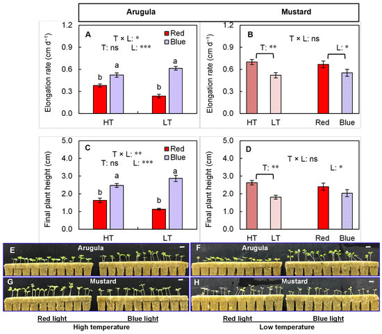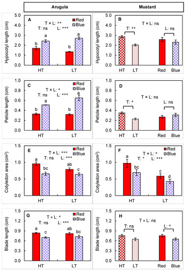 At harvest, plant height was not affected by temperature treatment for arugula but was increased by 45% in high vs. low temperature treatment for mustard (Figure 2C,D). Plants grown under blue vs. red light were longer by 52% at high temperatures and by 124% at low temperatures for arugula. The varying promotion effect of blue light was due to a light × temperature interaction effect. In contrast, for mustard, plants grown under blue light were 15% shorter than those under red light, and the light treatment effect was not affected by temperature treatment. The trends of plant elongation growth in light and temperature treatment were also supported by the side-view pictures taken at plant harvesting time (Figure 2E,H).
