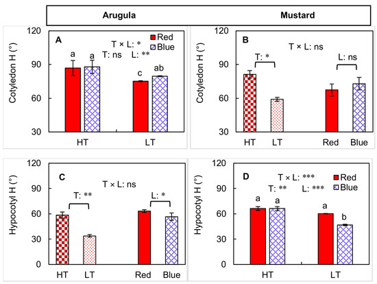 Color of cotyledon (A,B) and hypocotyl (C,D) under different light and temperature treatments. Data are means ± standard error. Plant color was indicated by hue angle (H). HT = high temperature; LT = low temperature. Treatment effects for each plant trait under different temperatures (T), lights (L), or the interactions of temperature and light (T × L) followed by ns, *, **, or *** denote that the treatment effects are not significant or significant at α = 0.05, 0.01, or 0.001, respectively. When the treatment effects of T × L are significant, the four treatment combinations of T × L are separated using different lower-case letters at α = 0.05 according to Tukey’s HSD (honestly significant difference) test.