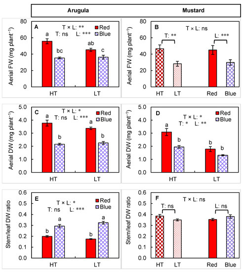 Aerial fresh weight (FW; (A,B)), aerial dry weight (DW; (C,D)), and ratio of stem/leaf DW (E,F) under different light and temperature treatments. Data are means ± standard error. HT = high temperature; LT = low temperature. Treatment effects for each plant trait under different temperatures (T), lights (L), or the interactions of temperature and light (T × L) followed by ns, *, **, or *** denote that the treatment effects are not significant or significant at α = 0.05, 0.01, or 0.001, respectively. When the treatment effects of T × L are significant, the four treatment combinations of T × L are separated using different lower-case letters at α = 0.05 according to Tukey’s HSD (honestly significant difference) test.