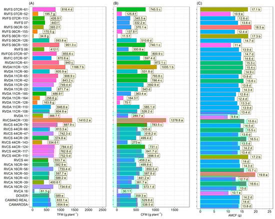 Total fruit mass (TFM)—(A), commercial fruit mass (CFM)—(B) and mean mass of commercial fruits (AMCF)—(C), in 36 strawberry genotypes (Fragaria × ananassa Duch.) and controls (‘Camarosa’, ‘Camino Real’, and ‘Dover’). Means followed by the same letter and the same color in the projection bars do not differ by the Scott–Knott test (p < 0.01).
