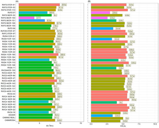 Soluble solids (SS)—(A) and pulp firmness (FIR)—(B) in 36 strawberry genotypes (Fragaria × ananassa Duch.) and controls (‘Camarosa’, ‘Camino Real’, and ‘Dover’). Means followed by the same letter and the same color in the projection bars do not differ by the Scott–Knott test (p < 0.01).