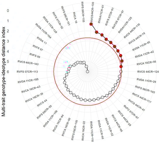 Multi-trait distance index plot of selected and unselected strawberry genotypes (Fragaria × ananassa Duch.) by using the genotype-ideotype selection index.