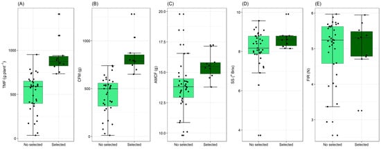 Boxplot analysis for selected strawberry genotypes (Fragaria × ananassa Duch.) compared with unselected genotypes showing outliers. Total mass of fruits (TMF)—(A), commercial fruit mass (CFM)—(B), Average mass of commercial fruits (AMCF)—(C), soluble solids (SS)—(D) and fruit firmness (FFIRM)—(E).