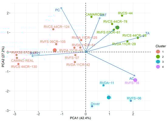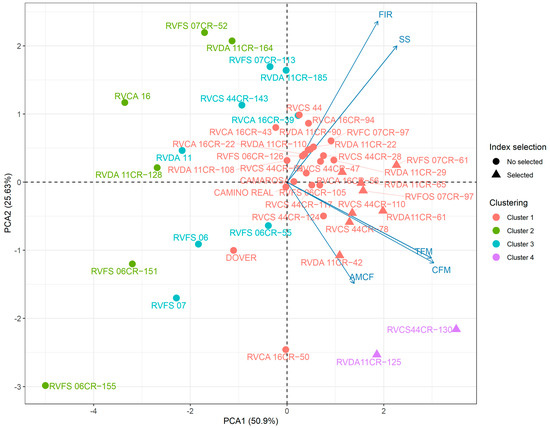 Principal component analysis (PCA) allows us to extract important information from a data set containing multiple inter-correlated quantitative variables. This is possible since it reshapes data along principal component axes, reducing their dimensionality in an interpretable way [1,36]. The PCA showed that most of the variance (76.53%) was explained by the two first components. All selected genotypes belong to clusters 2 (six genotypes) and 4 (two genotypes). Among these, seven genotypes were selected, with the productive traits as the main component and the others based on SS content and pulp firmness (FIR) (Figure 5).