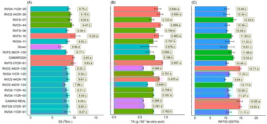 Soluble solids (SS)—(A), titratable acidity (TA)—(B), and ratio (SS/TA)—(C) of 10 selected strawberry genotypes (Fragaria × ananassa Duch.). Means followed by the same letter and the same color in the projection bars do not differ by the Scott–Knott test (p < 0.01).