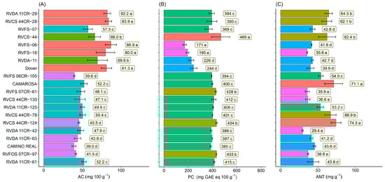 Ascorbic acid (AC)—(A), phenolic compounds (PC)—(B), and total anthocyanins (ANT)—(C) in the fruits of 10 selected strawberry genotypes (Fragaria × ananassa Duch.). Means followed by the same letter and the same color in the projection bars do not differ by the Scott–Knott cluster test (p < 0.01).