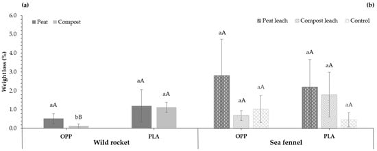 Weight loss of fresh-cut wild rocket (a) and sea fennel (b) cultivated in different growing media and their leachates, respectively, packaged in OPP or PLA bags for storage during 7 days at 4 °C. Different lowercase letters indicate significant differences among treatments for each vegetable, while different uppercase letters indicate significant differences between packages of each crop at p = 0.05 according to Tukey’s test. OPP: oriented polypropylene bags; PLA: polylactic acid bags.