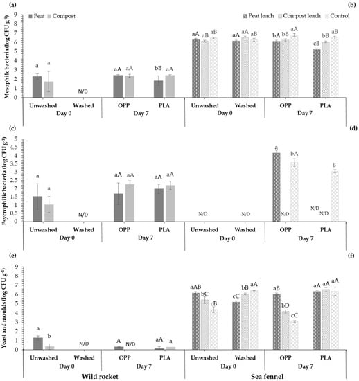 Mesophilic bacteria, psychrophilic bacteria, and yeast and mould counts (log CFU g−1) of fresh-cut wild rocket (a,c,e) and sea fennel (b,d,f) cultivated in different growing media and their leachates, respectively, packaged in OPP or PLA bags, and stored during 7 days at 4 °C. Values at harvest (day 0) and at the end of storage (day 7). Different lowercase letters indicate significant differences among treatments for each vegetable, while different uppercase letters indicate significant differences between packages at p = 0.05 according to Tukey’s test. N/D: non detected. OPP: oriented polypropylene bags; PLA: polylactic acid bags.