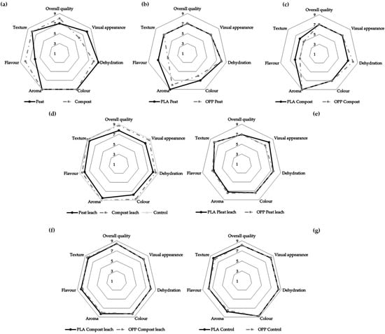 Sensory quality of fresh-cut wild rocket (a–c) and sea fennel (d–g) cultivated in different substrates and their leachates, respectively, packaged in OPP or PLA bags and stored during 7 days at 4 °C. (a) Rocket leaves from plants grown in peat and compost, at harvest. (b) Rocket leaves from plants grown in peat after 7 days in OPP or PLA bags. (c) Rocket leaves from plants grown in compost after 7 days in OPP or PLA bags. (d) Sea fennel leaves from plants treated with ‘peat leach’, ‘compost leach’, and ‘control’, at harvest. (e) Sea fennel leaves from plants treated with ‘peat leach’ after 7 days in OPP or PLA bags. (f) Sea fennel leaves from plants treated with ’compost leach’ after 7 days in OPP or PLA bags. (g) Sea fennel leaves from ‘control’ plants after 7 days in OPP or PLA bags. OPP: oriented polypropylene bags; PLA: polylactic acid bags.