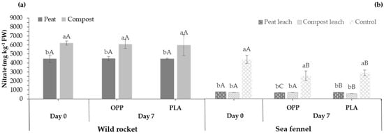 Nitrate content of fresh-cut wild rocket (a) and sea fennel (b) cultivated in different growing media and their leachates, respectively, packaged in OPP or PLA bags and stored during 7 days at 4 °C. Values at harvest (day 0) and at the end of storage (day 7). Different lowercase letters indicate significant differences among treatments, while different uppercase letters indicate significant differences between packages at p = 0.05 according to Tukey’s test. OPP: oriented polypropylene bags; PLA: polylactic acid bags.