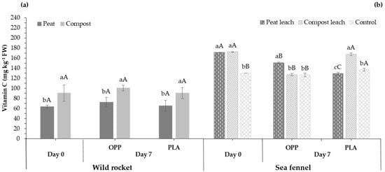 The vitamin C content for sea fennel was higher than in wild rocket (Figure 5b). Interestingly, compost and peat leachates significantly increased the vitamin C in leaves compared with the control. A slight decrease was observed during storage, with the highest content in the plants grown in compost leach and stored in PLA. That decrease could be avoided by a MAP with lower oxygen concentrations resembling the atmosphere composition observed for wild rocket. These results confirm that sea fennel is a vegetable rich in vitamin C, quite stable during storage in a biodegradable package, and in agreement with those results previously reported by Renna [55].