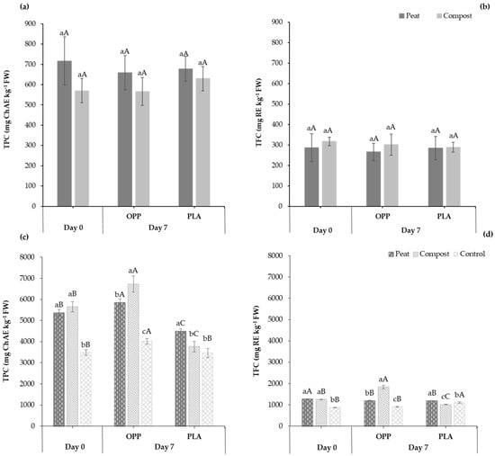 Total phenols (a–c) and total flavonoids (b–d) of fresh-cut wild rocket (a,b) and sea fennel (c,d), respectively, cultivated in different growing media and their leachates, respectively, packaged in OPP or PLA bags and stored during 7 days at 4 °C. Values at harvest (day 0) and at the end of storage (day 7). Different lowercase letters indicate significant differences among treatments for each vegetable, while different uppercase letters indicate significant differences between packages at p = 0.05 according to Tukey’s test. OPP: oriented polypropylene bags; PLA: polylactic acid bags.