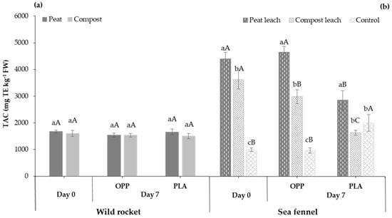 At harvest, the antioxidant capacity in rocket leaves was similar in all the treatments and within the ranges previously reported by other authors [56] and particularly for this species [51], varying from 1.450 to 1.680 mg TE kg−1 FW (Figure 7a). As observed for TPC, there were no significant variations in TAC during storage at 4 °C. Furthermore, there were no significant differences between rocket plants cultivated in peat or compost. The same happened for the type of package which did not affect the total antioxidant capacity of the leaves. For short storage periods at low temperatures (<5 °C), TAC has been shown to be constant indicating a high stability of rocket in its antioxidant system. That stability has been previously reported even when the leaves had to cope with strong physical stresses [56]. Sea fennel (Figure 7b) had higher TAC content when plants were cultivated with peat and compost leachates (4.672 and 3.643 mg TE kg−1 FW, respectively) when compared to the control (971 mg TE kg−1 FW), indicating that antioxidants can be favoured with sea fennel as a secondary crop and wild rocket as the primary. To our knowledge, this is the first time that this beneficial effect of leachates on nutritional quality has been identified. Stressing growing conditions, such as the accumulation of toxic ions in the leaves (i.e., Cl−, Na+ 388) and/or the alkaline pH of the NS, can affect sea fennel plants and enhance their phytochemical content [26]. It is well stablished that plants cope with abiotic stress by altering metabolic processes producing reactive oxygen species and stimulating antioxidant activity to scavenge free radicals and ion chelators [56]. TAC decreased during storage, with the highest values for the OPP bags.