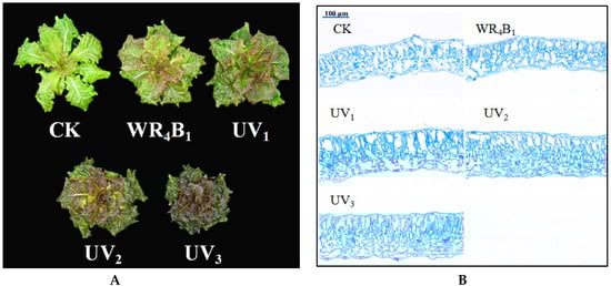Purple lettuce growth was significantly affected by the different light quality treatments (Table 1). Compared to the WRB (white light mixed with red and blue light), stem diameter and dry mass of purple leaves lettuce increased significantly under the SUV1 and SUV2 treatments, and stem diameter was significantly higher under the SUV2 treatment than under the other treatments. Leaf expansion decreased progressively with increasing UV-A dose, while it was greatest under the WRB treatment. Fresh leaf mass was significantly higher under SUV1 and SUV2 treatments than under the SUV3 treatment. Using scanning electron microscopy to observe paraffin sections with different treatments, UV-A substitution significantly increased leaf thickness compared to WRB, and thickness increased with increasing UV-A doses, as can be seen from Figure 1B.