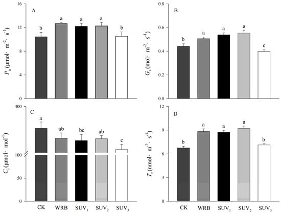 Photosynthesis parameters are important indexes for assessing photosynthesis capacity in plant. From Figure 2, compared with the W (CK), the stomatal conductance (Gs) and transpiration rate (Tr) increased significantly under WRB, SUV1 and SUV2 treatments, and the net photosynthetic rate (Pn) increased by 21%, 17% and 18%, respectively, while the (Ci) decreased. Additionally, the Gs, Ci and Tr increased significantly under WRB, SUV1, and SUV2 compared with those of W and SUV3. The SUV3 treatment decreased significantly the Gs and Ci, while they were same in the Pn and Tr compared with the W.