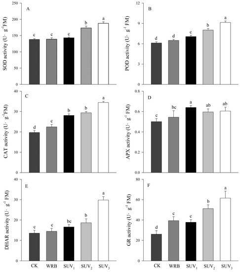 The antioxidant enzyme activity of the WRB treatment was not significantly different from the W, except CAT and GR activities, which were significantly higher than those of the W. Compared with the WRB, except APX activity, SUV2 and SUV3 treatments significantly stimulated the improvement of antioxidant enzyme activity in purple lettuce (Figure 4A–F). Additionally, compared with the WRB, SOD activity increased by 26% and 36% (Figure 4A), POD activity increased by 24% and 41% (Figure 4B), CAT activity increased by 31% and 53% (Figure 4C), DHAR activity increased by 29% and 107% (Figure 4D), GR activity increased by 30% and 56% under SUV2 and SUV3 treatments (Figure 4E). It is worth mentioning that the POD, CAT, APX activity under SUV1 were significantly higher that the WRB treatments; however, the trend was not consistent with the SOD and DHAR.