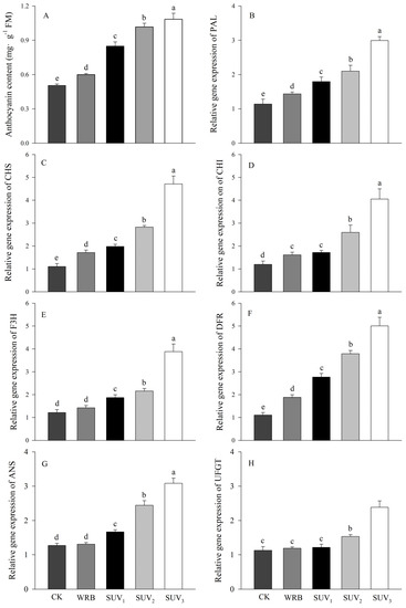 The determination of anthocyanin content in purple lettuce showed that the anthocyanin content increased significantly with increasing UV-A dose (Figure 5). Compared to the W, the WRB treatment increased the expression of related structural genes to varying degrees, and the addition of UV-A treatment further upregulated the related genes. SUV2 and SUV3 treatments increased the expression of related structural genes more significantly. The expression levels of PAL, CHS, CHI, DFR, ANS and UFGT under SUV2 treatment increased by 46%, 65%, 61%, 52%, 102%, 86% and 29%, respectively, compared to WRB treatment.