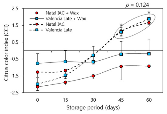 | Citrus color index—CCI | 1.57 ± 0.34 b | 2.11 ± 0.06 a | 13.0 | 7.60* |