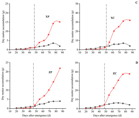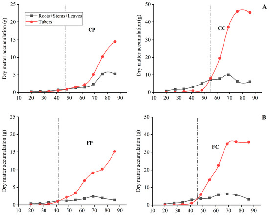 Comparison of dry matter accumulation balance period of Chuanyu 117 (A), Favorita (B), Shepody (C), and Zhongshu No. 3 (D) between pre-elite and certified seeds. The graph on the left represents pre-elite seeds, and the graph on the right represents certified seeds. The dashed line represents the beginning of tuber yield formation. CC, FC, XC, and ZC represent the certified seeds of Chuanyu 117, Favorita, Shepody, and Zhongshu No. 3, respectively. CP, FP, XP, and ZP represent the pre-elite seeds of these four varieties, respectively.