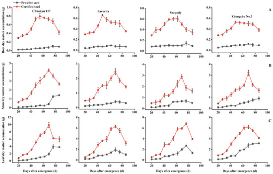 The dry matter accumulation of the roots, stems, and leaves of both the pre-elite and certified seeds showed a single-peaked curve for the growth process, and the dry matter accumulation of all organs of the certified seeds was higher than that of the pre-elite seeds (Figure 2). The roots dry matter accumulation of each pre-elite seed reached its maximum value later than that of the certified seed, averaging 15.75 d (Figure 2A). The stem dry matter accumulation of the pre-elite seeds of Chuanyu 117 and Zhongshu No. 3 increased until harvest, while Favorita and Shepody reached a maximum at 69 and 76 d, respectively; in addition, the certified seeds of all four varieties showed a complete single-peaked curve change (Figure 2B). It can be seen that the leaf dry matter accumulation of each pre-elite seed reached a maximum at a later period than its certified seed, with an average of 5.25 d later (Figure 2C).