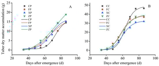 Comparison of tuber dry matter accumulation of different varieties of potato between pre-elite seeds (A) and certified seeds (B). The dots represent numerical values, while lines are a “logistic” fit of these values. CC, FC, XC, and ZC represent the certified seeds of Chuanyu 117, Favorita, Shepody, and Zhongshu No. 3, respectively. CP, FP, XP, and ZP represent the pre-elite seeds of these four varieties, respectively.