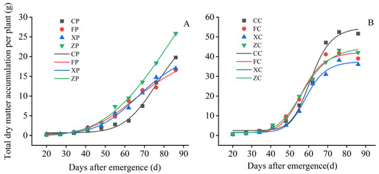 Comparison of whole-plant dry matter accumulation of different varieties of potato between pre-elite seeds (A) and certified seeds (B). The dots represent numerical values, while lines are a “logistic” fit of these values. CC, FC, XC, and ZC represent the certified seeds of Chuanyu 117, Favorita, Shepody, and Zhongshu No. 3, respectively. CP, FP, XP, and ZP represent the pre-elite seeds of these four varieties, respectively.