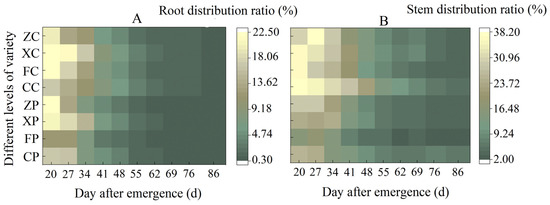 Comparison of dry matter distribution ratios within roots (A), stems (B), leaves (C), and tubers (D) of different varieties of potato between pre-elite and certified seeds. The darker the color, the lower the distribution ratio. CC, FC, XC, and ZC represent the certified seeds of Chuanyu 117, Favorita, Shepody, and Zhongshu No. 3, respectively. CP, FP, XP, and ZP represent the pre-elite seeds of these four varieties, respectively.
