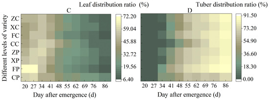 Potato (Solanum tuberosum L.) is one of the world’s most important staple food crops, with an annual production of more than 323 million tons [1,2]. Dry matter accumulation is the material basis for potato yield formation [3], and the direction of dry matter distribution is an important factor in determining the yield of tubers [4]. Dry matter distribution centers must change as different organs perform different tasks at different times [5]. Potato plants derive 90–95% of their dry matter from photosynthesis-assimilated products, and the distribution of assimilated products in the organs varies with the growth and development process of potatoes [6]. The accumulation, distribution, and transfer of assimilation products during reproduction directly affect the formation of tuber yield, and the more dry matter is accumulated to a certain extent, the higher the tuber distribution, the higher the economic coefficient, and the higher the yield [7]. Compared to cereal crops, potatoes need to accumulate more dry matter to ensure yield [8].