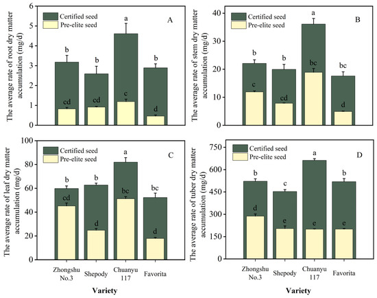 The rate of dry matter accumulation varied among different varieties and organs (Figure 6), and the average rate of dry matter accumulation in each organ was sorted by size of tubers > leaves > stems > roots. The average dry matter accumulation rate of pre-elite seeds was lower than that of certified seeds, and all reached a significant level (p < 0.05), with the average dry matter accumulation rate of certified seeds being significantly higher than that of pre-elite seeds by 382.61% for roots (Figure 6A), 219.81% for stems (Figure 6B), 184.65% for leaves (Figure 6C), and 241.94% for tubers (Figure 6D). However, between the pre-elite and certified seeds, there was no significant difference in the percentage of dry matter accumulation rate in each organ to the whole plant. In the pre-elite seeds, roots, stems, leaves, and tubers accounted for 0.31%, 3.97%, 12.60%, and 83.12% of whole-plant dry matter accumulation, respectively; in the certified seeds, roots, stems, leaves, and tubers accounted for 0.53%, 3.76%, 10.17%, and 85.54% of whole-plant dry matter accumulation, respectively.