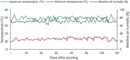 The experiment was conducted using drainage lysimeters under greenhouse conditions at the Agricultural Engineering Academic Unit of the Federal University of Campina Grande in Campina Grande, Paraíba, Brazil (coordinates: 7°15′18″ S, 35°52′28″ W, elevation of 550 m a.s.l.). Meteorological data observed during the experimental period are shown in Figure 1.