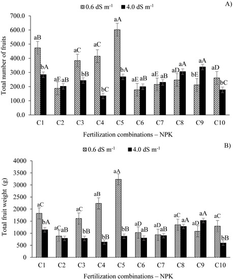 The highest values of fruit production were observed in plants irrigated with low-salinity water (0,6 dS m−1) and treated with fertilization combinations C5 (602.2), C1 (473.5), C4 (414.9), and C3 (383.8), differing statistically from each other (p ≤ 0.01) and from the plants irrigated with the ECw of 4.0 dS m−1 and treated with combinations C5 (269), C1 (284.1) C4 (133.9), and C3 (243.1), respectively. On the other hand, the plants irrigated with the ECw of 4.0 dS m−1 showed the highest fruit production values when treated with combinations C9, C8, C5, and C1, but only the plants which received the C9 combination differed (p ≤ 0.01) from the plants irrigated with the ECw 0.6 dS m−1.