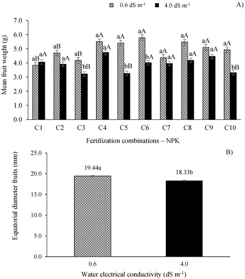 Mean fruit weight (A) and equatorial fruit diameter (B) of West Indian cherry as a function of the interaction between ECw and NPK fertilization combinations 140 days after pruning during the second year of production. For description of fertilizer combinations (C), see Figure 2. Means followed by identical uppercase letters indicate that, for the same type of water, there are no significant differences between fertilization combinations found by the Scott–Knott test at p > 0.05 probability. Identical lowercase letters in the same fertilization combination indicate no significant difference between salinity levels (F-test, p > 0.05). Mean of three replicates ± standard error.