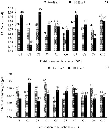 The results shown in Figure 4A reveal that the titratable acidity (% citric acid) of West Indian cherry plants irrigated with ECw of 4.0 dS m−1 differed (p ≤ 0.01) from those grown with ECw of 0.6 dS m−1, except in plants that received fertilization combinations C10 and C5. Furthermore, the TA increased (p ≤ 0.01) in plants irrigated with the higher salinity water (4.0 dS m−1) paired with fertilization combinations C1, C3, C4, C6, C7, and C8.