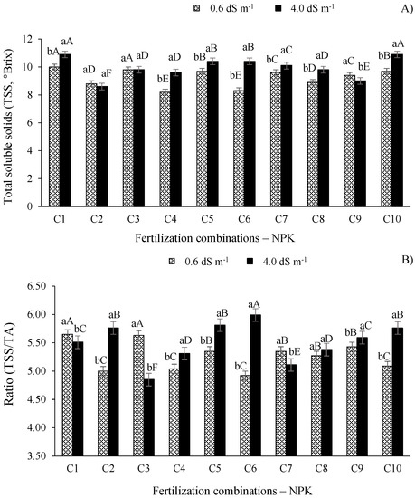 Total soluble solids (A) and maturity index ratio—TSS/TA (B) of West Indian cherry pulp as a function of the interaction between the ECw and combinations of NPK fertilization evaluated in the second year of production. For description of fertilizer combinations (C) see Figure 2. Means followed by identical uppercase letters indicate that, for the same type of water, there are no significant differences between fertilization combinations by the Scott–Knott test at p > 0.05 probability. Identical lowercase letters in the same fertilization combination indicate no significant difference between salinity levels (F-test, p > 0.05). Mean of three replicates ± standard error.