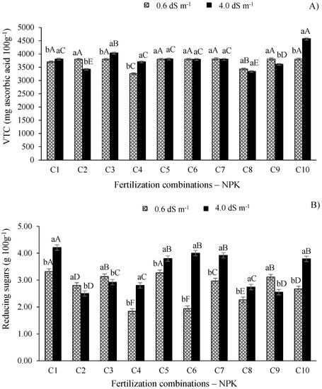 Vitamin C (A) and reducing sugars (B) of West Indian cherry pulp as a function of the interaction between the ECw and NPK fertilization combinations in the second year of production. For description of fertilizer combinations (C) see Figure 2. Means followed by identical uppercase letters indicate that, for the same type of water, there are no significant differences between fertilization combinations by the Scott–Knott test at p > 0.05 probability. Identical lower-case letters in the same fertilization combination indicate no significant difference between salinity levels (F-test, p > 0.05). Mean of three replicates ± standard error.