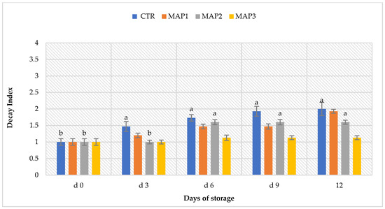 Decay index (D.I.) rated from 1 to 4 on litchi fruit measured for 9 days post-treatment in cold storage at 5 ± 1 °C. Values are expressed as mean ± SD. Means with the same letter are not significantly different at p ≤ 0.05 (Tukey’s test). CTR: control fruit; MAP 1: (10% O2 + 20% CO2 + 70% N2); MAP 2: (20% O2 + 20% CO2 + 60% N2); MAP 3: (5% O2 + 20% CO2 + 75% N2). Lowercase letters indicate differences for the same treatment during the storage period. Where there are no letters, differences are not statistically significant.